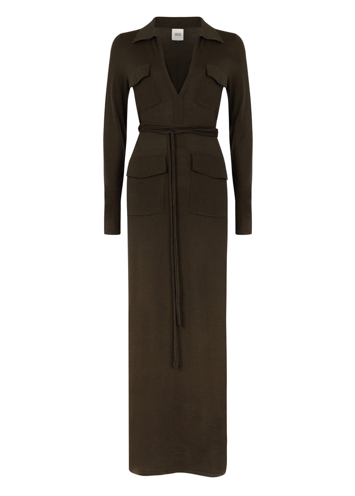 Relaxed structure meets quiet sophistication. The Lita Knit Dress is crafted from a soft, midweight knit that skims the body with an effortless drape. Designed with utilitarian-inspired double patch pockets and a wrap-around belt, it strikes a balance between form and function — easy yet defined. A deep V neckline and clean lines lend a modern femininity, while the belt cinches gently at the waist, allowing you to shape the silhouette to your mood. Equally at home layered with a heeled boots for the city, or worn casually with flats.