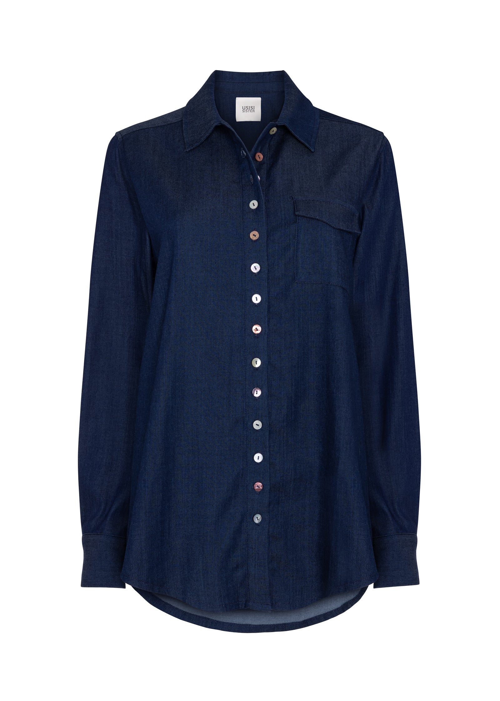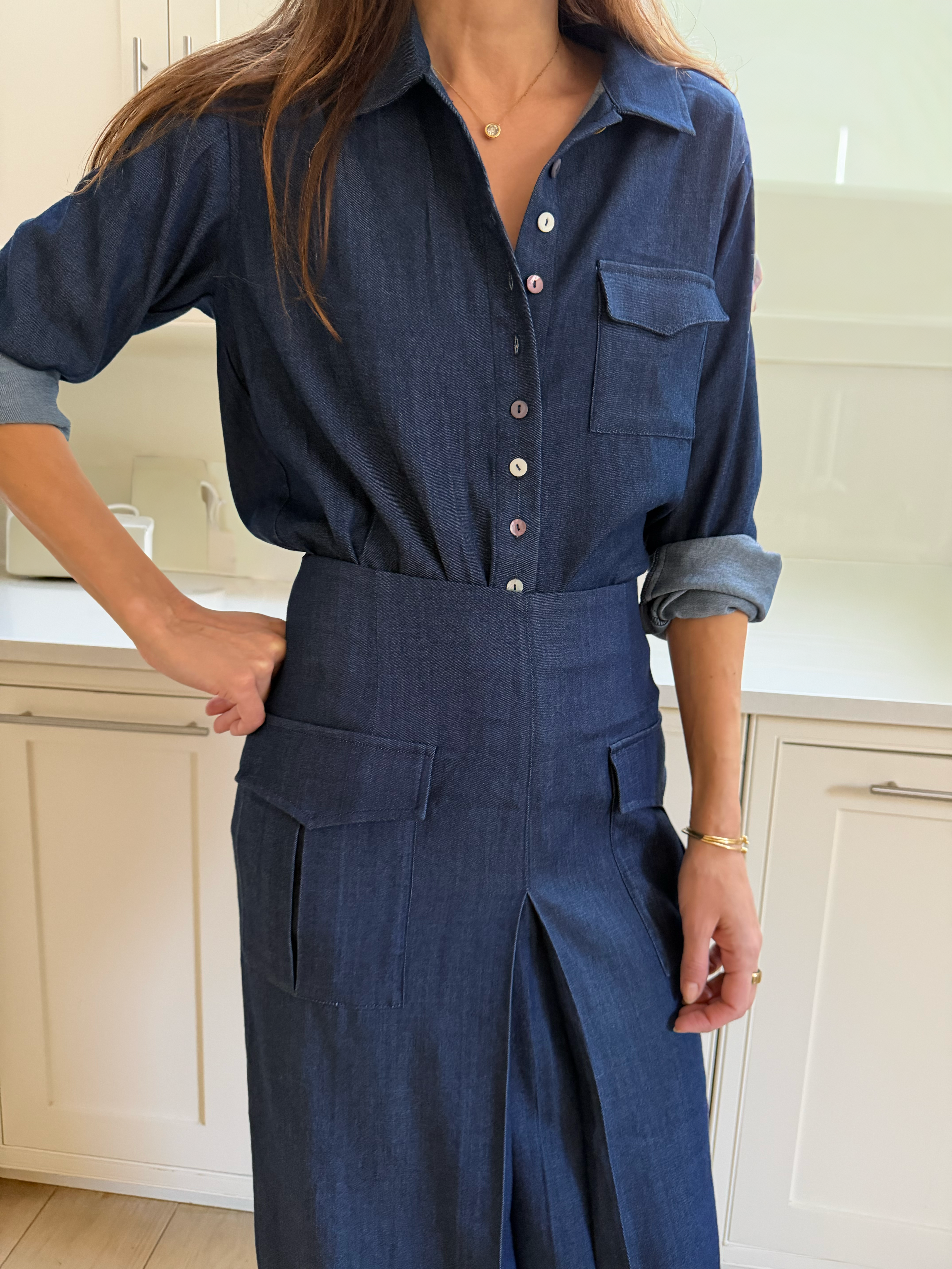 A refined take on a classic workwear staple. The Gala shirt is cut from deep indigo denim, this shirt is defined by its pearl button and its light weight fabrication. The buttons, luminous against the saturated fabric, adding quiet distinction without excess. The silhouette is relaxed yet precise, designed to be worn with the Gala skirt but versatile enough to be worn with virtually any trouser.