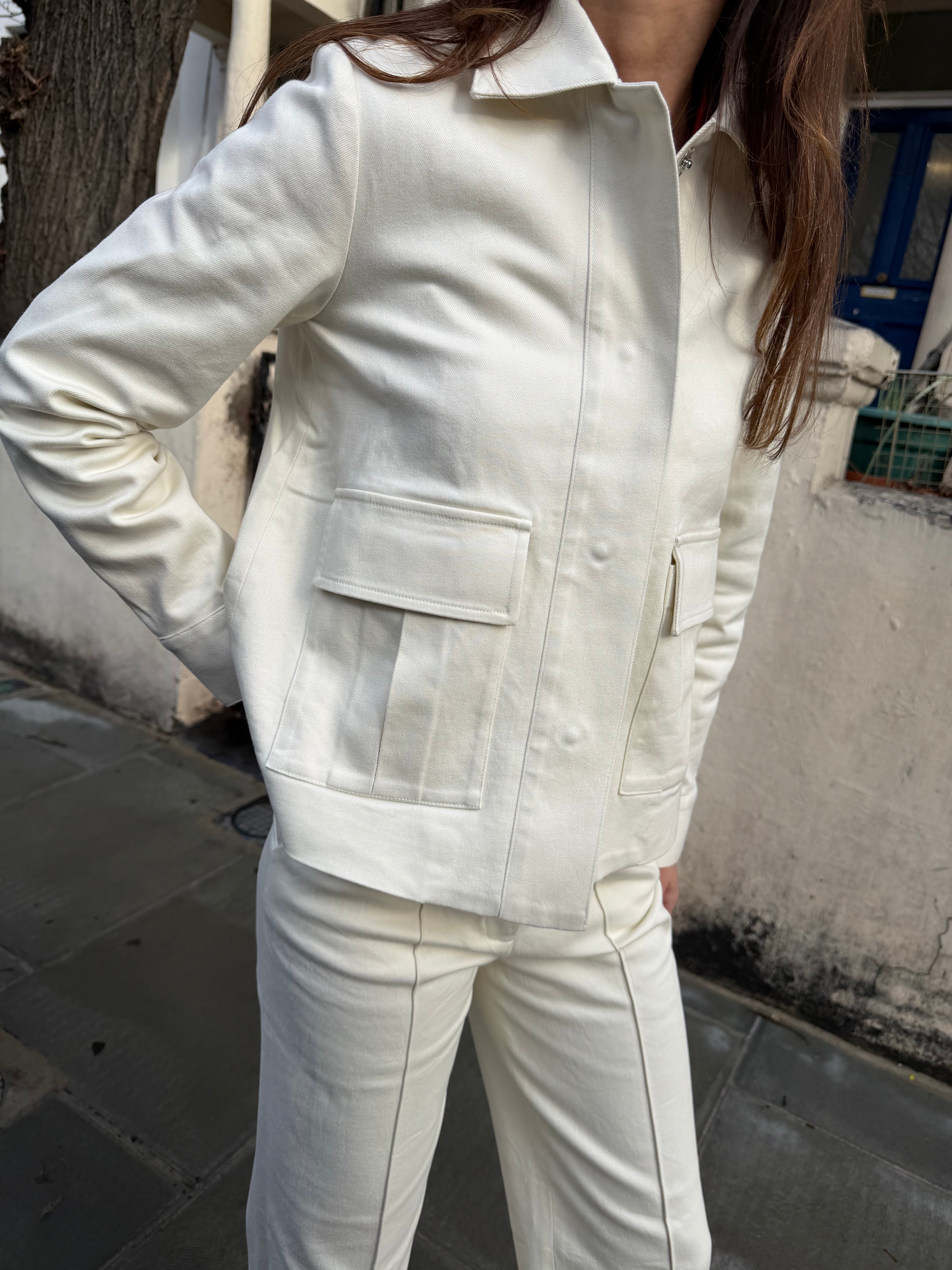 A modern uniform layer, the Gigi jacket is cut from structured off white cotton twill, designed to balance form and function. Patch pockets anchor the silhouette, while oversized popper closures add a subtle industrial note. Clean lines and a composed fit give the piece its versatility without excess.