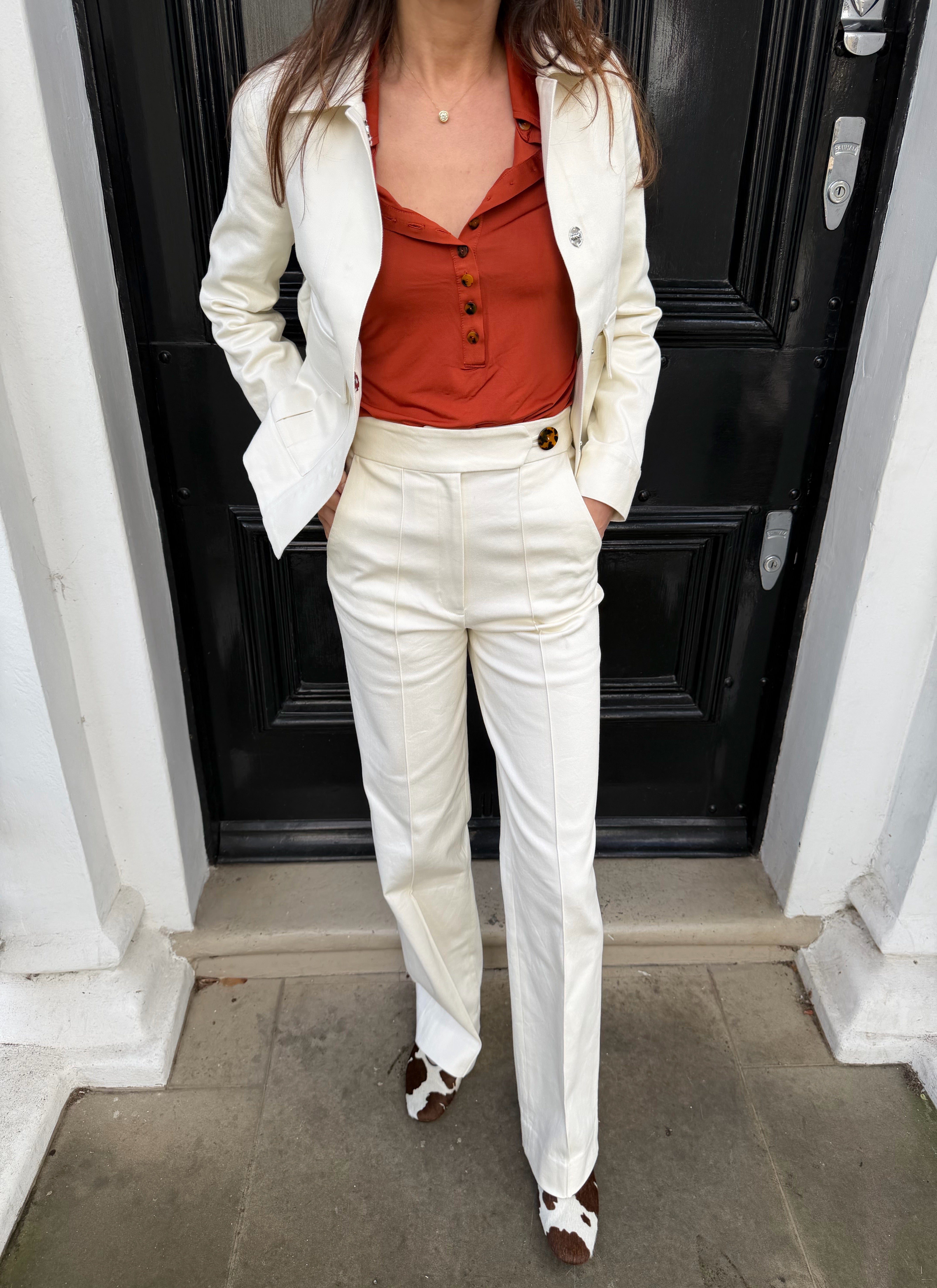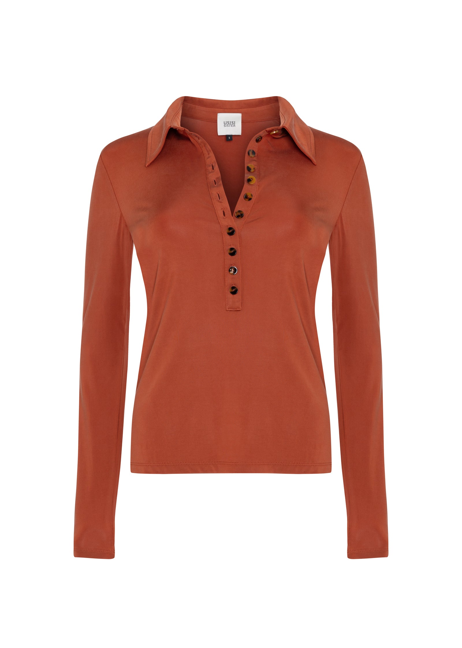 Our hero item of the season, the Kit top. A refined essential cut from fluid cupro with a soft, silky finish, this rust-toned top has a subtly sharp collar and tortoise shell buttons. A versatile foundation for a modern wardrobe.