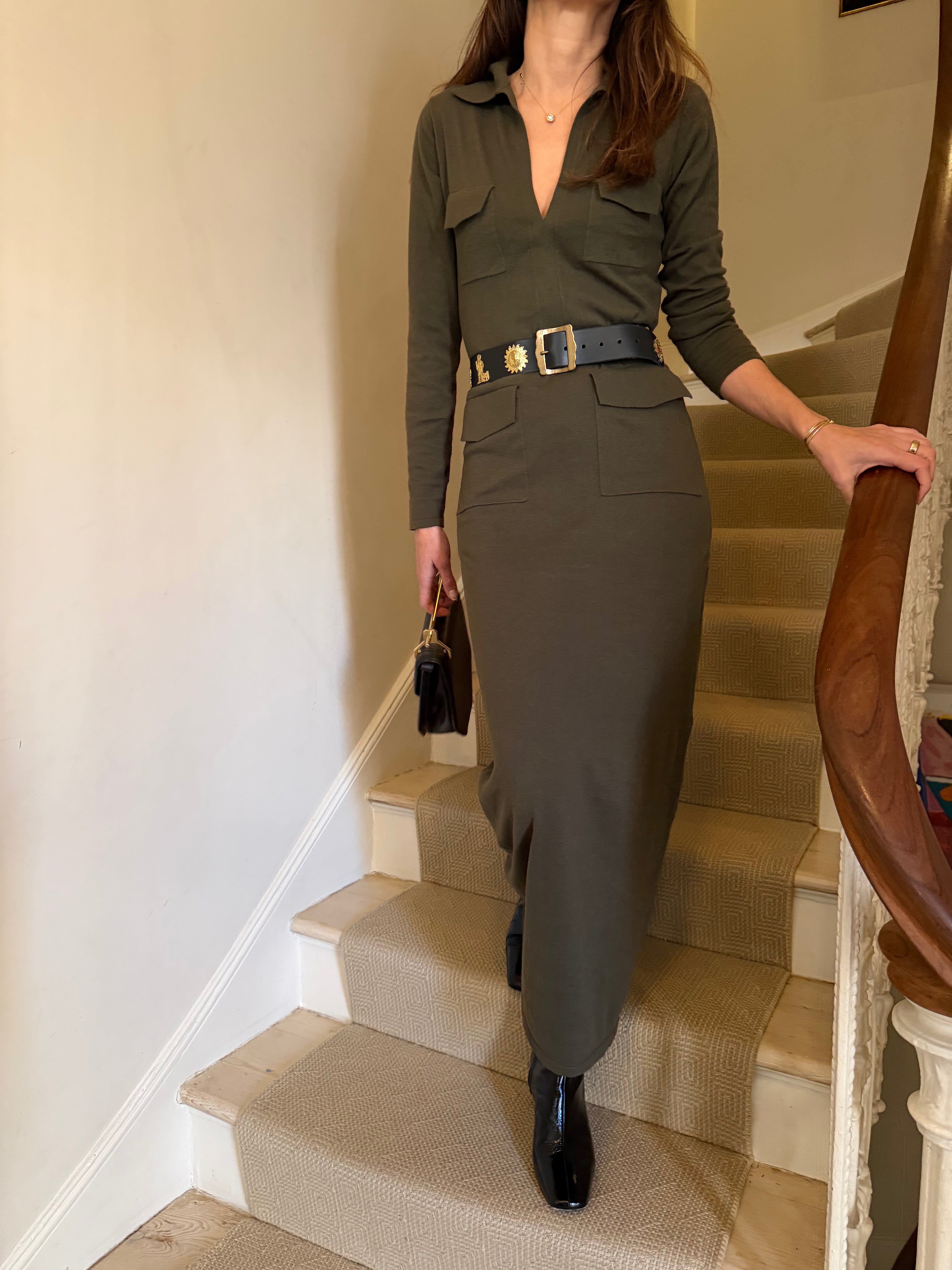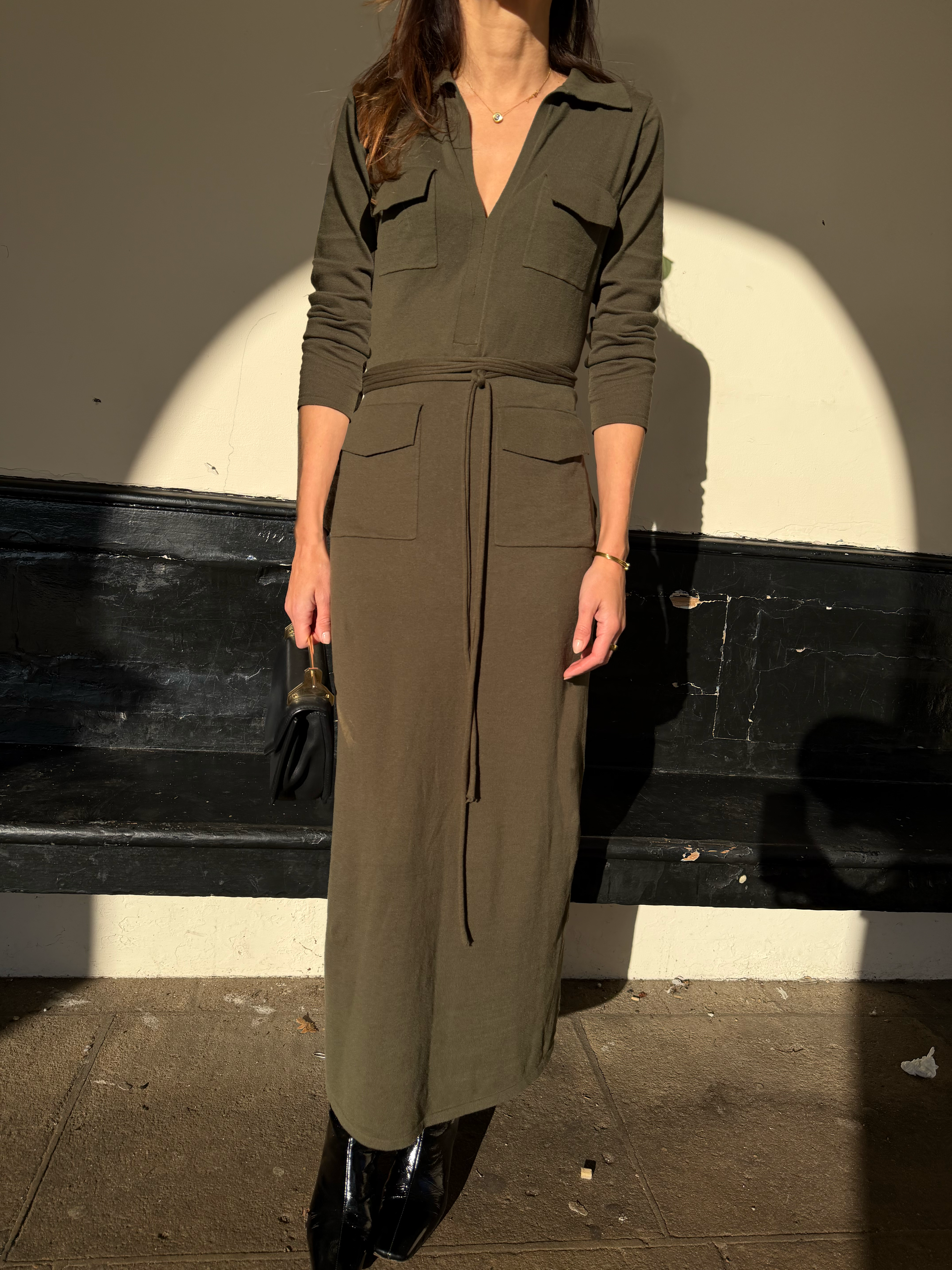 Relaxed structure meets quiet sophistication. The Lita Knit Dress is crafted from a soft, midweight knit that skims the body with an effortless drape. Designed with utilitarian-inspired double patch pockets and a wrap-around belt, it strikes a balance between form and function — easy yet defined. A deep V neckline and clean lines lend a modern femininity, while the belt cinches gently at the waist, allowing you to shape the silhouette to your mood. Equally at home layered with a heeled boots for the city, or worn casually with flats.