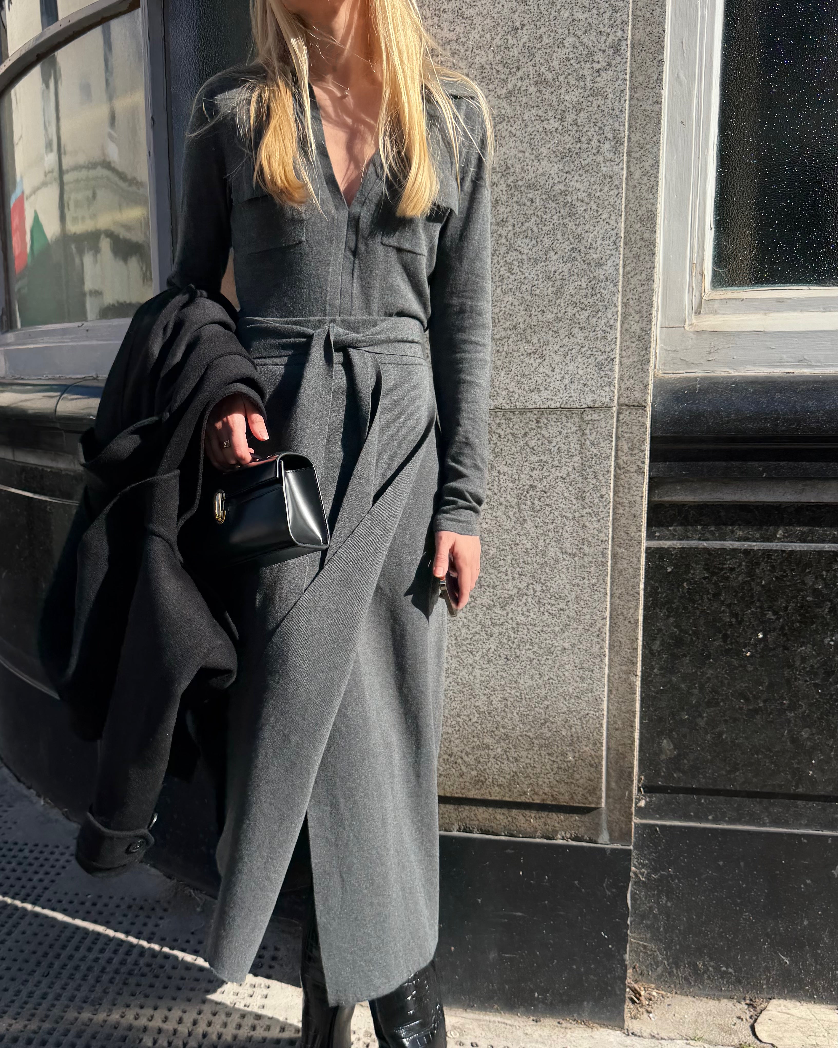 Effortless ease, quietly refined. The Lotta Knit Skirt is crafted from the same soft midweight knit as the matching top — a textured grey that moves fluidly with the body. Though designed in a wrap style, it slips on with ease, cinching at the waist with a slender tie belt for a relaxed, flattering fit. Falling to a midi length with a natural drape, it embodies simplicity and versatility — ideal paired with the Cleo Knit Top for a considered, tonal look, or balanced with crisp shirting for everyday ease.